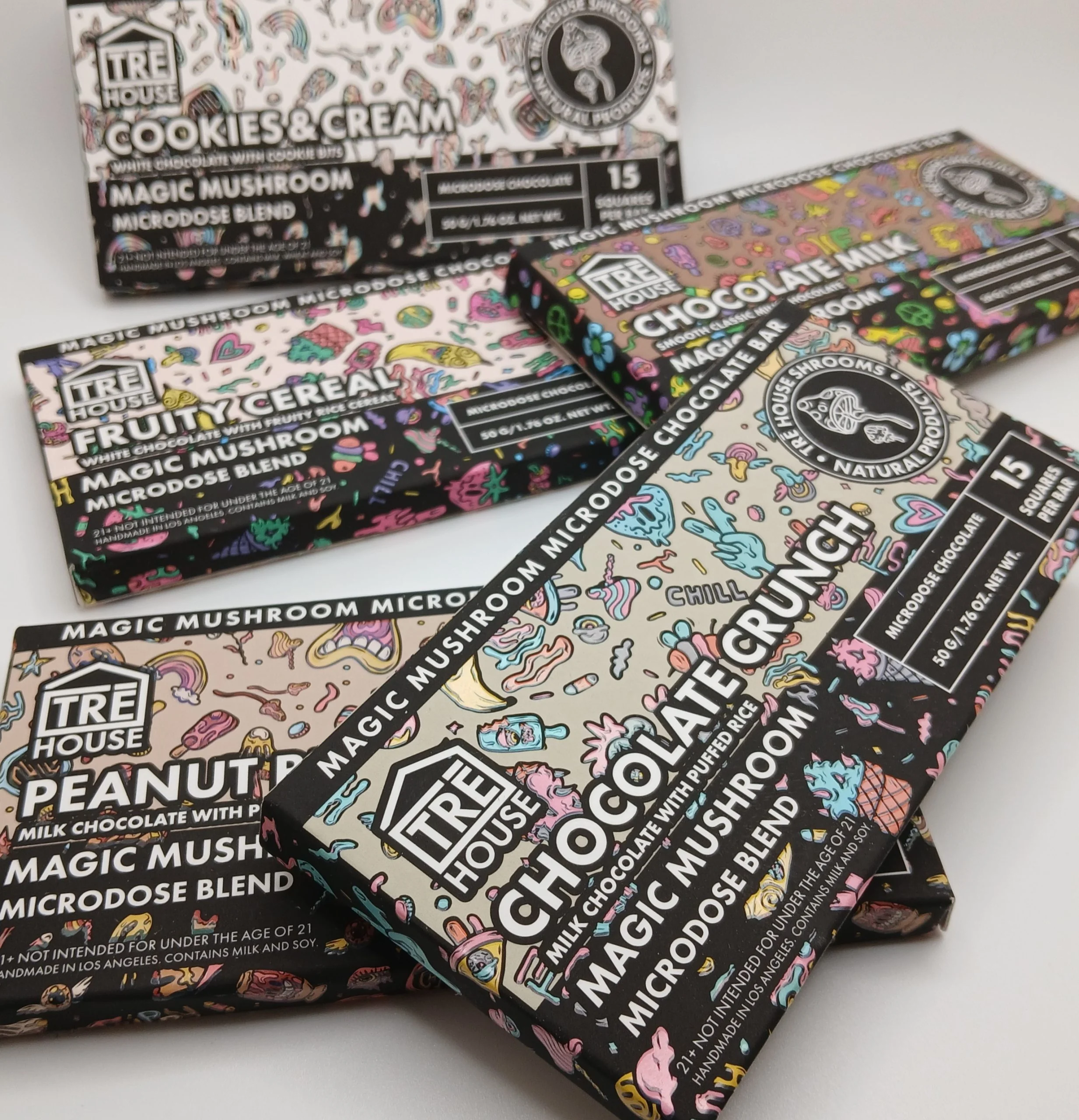 Tre House Magic Mushroom Bar is a premium mushroom-infused chocolate available in seven gourmet flavors—Chocolate Crunch, Chocolate Milk, Cookies and Cream, Fruity Cereal, Peanut Butter, Churro Milk, and Cookies and Screams—delivering taste, indulgence, and subtle elevation.